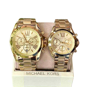 Bold and sophisticated, the Michael Kors Bradshaw Chronograph Gold-Tone Couple Set is designed for couples who appreciate statement style with classic elegance. Crafted in radiant gold-tone stainless steel and featuring a detailed chronograph dial, this luxurious set combines fashion and function—perfect for everyday wear or special occasions.