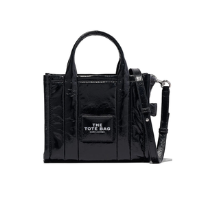 Glossy texture meets bold design in the Marc Jacobs Shiny Crinkle Small Tote, a compact statement piece in sleek black.