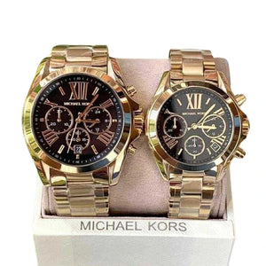 Striking and sophisticated, the Michael Kors Bradshaw Gold & Black Dial Couple Set blends bold contrast with timeless design. Featuring a rich black chronograph dial set against a polished gold-tone stainless steel case and bracelet, this set is perfect for couples who love standout luxury with a modern edge.