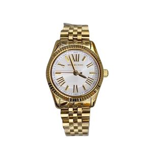 Delicate in size, bold in style — the Michael Kors MK3229 Mini Lexington is the perfect blend of sophistication and subtlety. With its petite 26mm gold-tone case and clean white dial, this watch is designed for women who love timeless elegance in a compact silhouette.